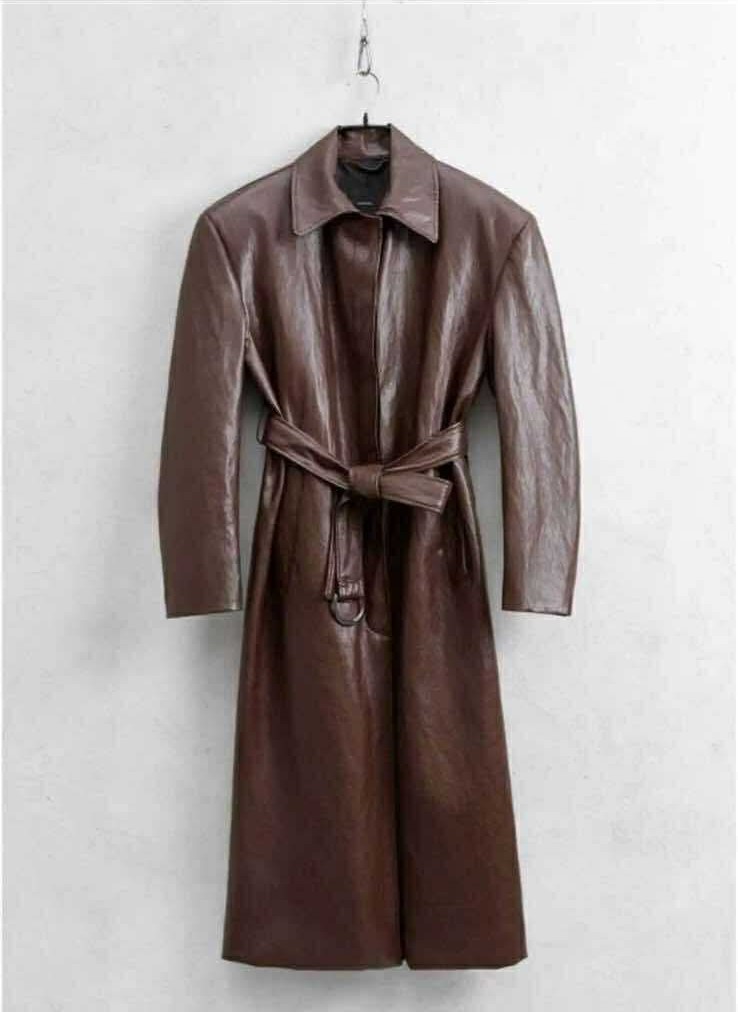 Crafted from glossy leather, it features a classic collar, long sleeves, and a belted waist that cinches the silhouette for a powerful yet feminine look.