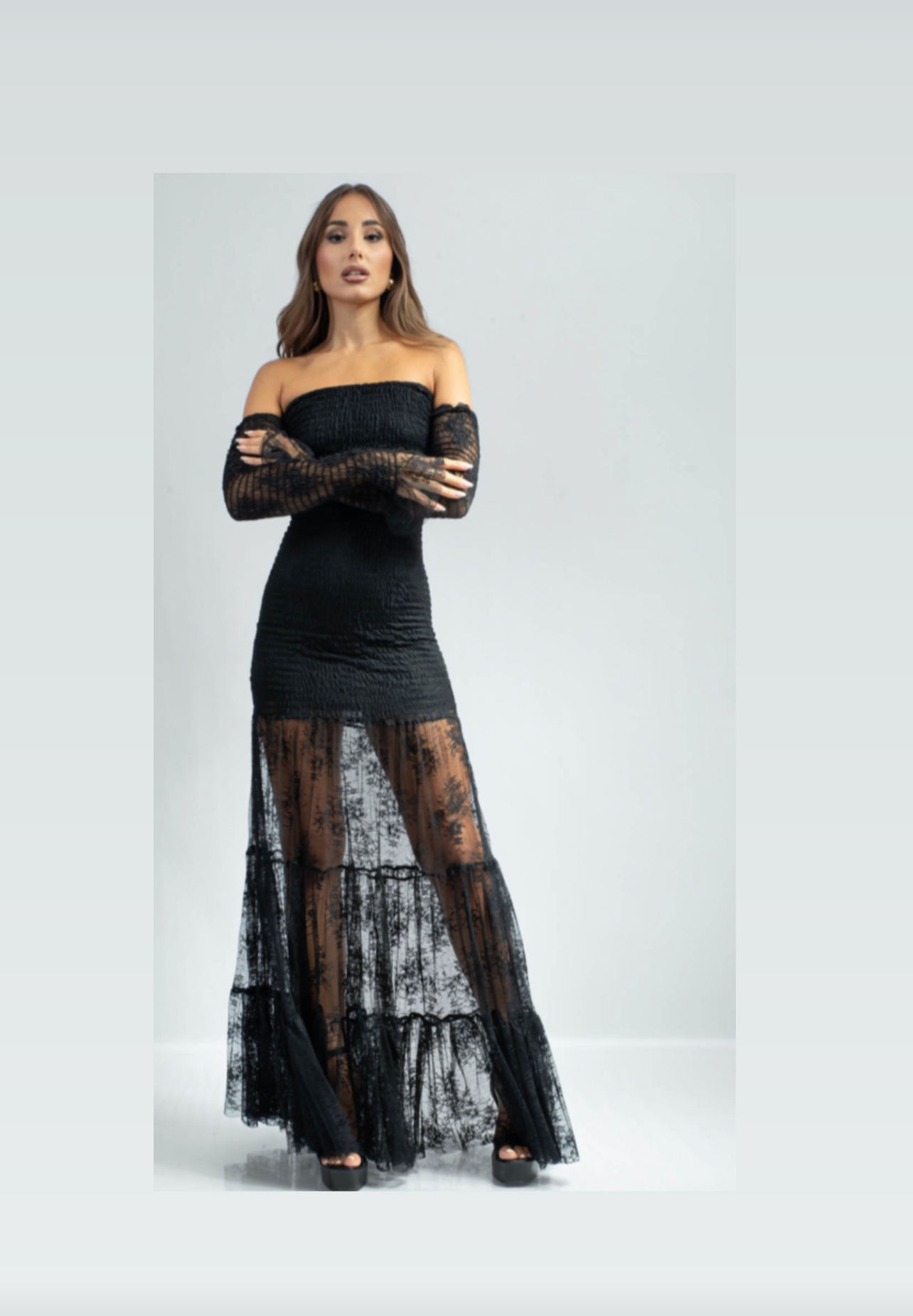 The semi-sheer lace detailing with tiered layers at the skirt brings movement and drama, making it perfect for evening occasions.