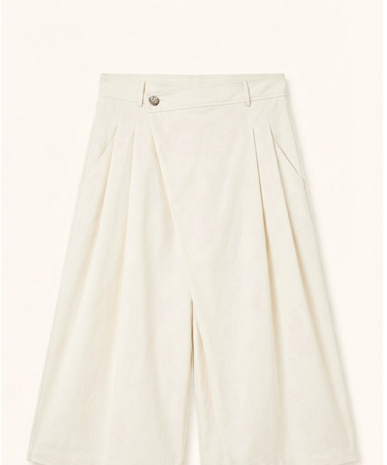 • Regular waist with belt loops and detail asymmetrical strap with button closure.