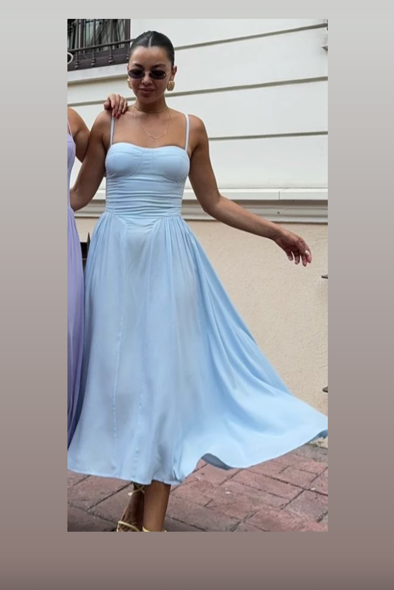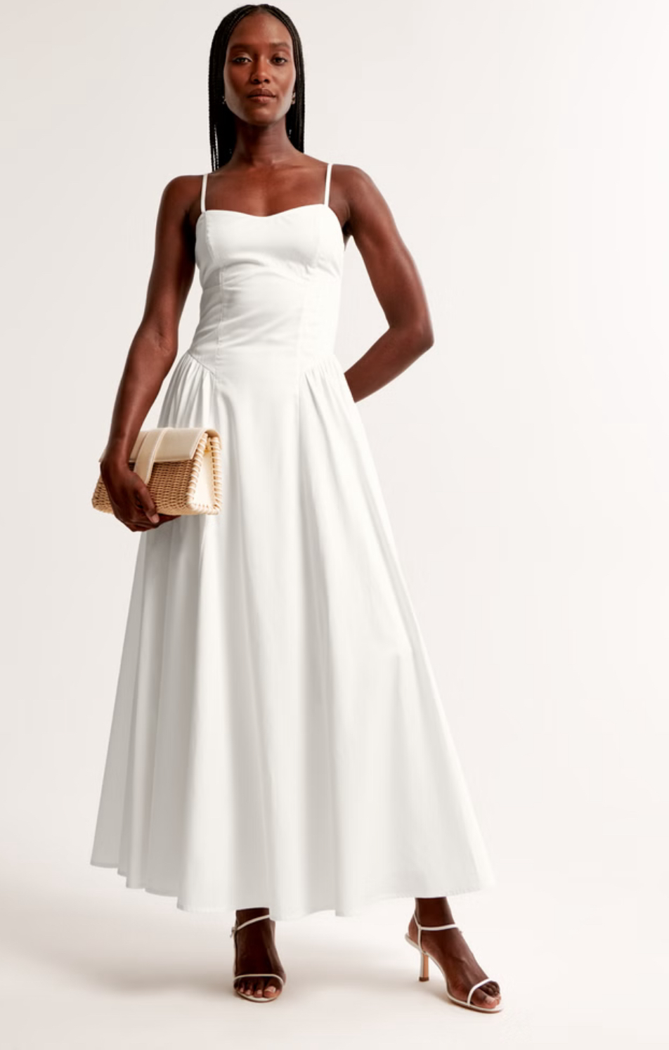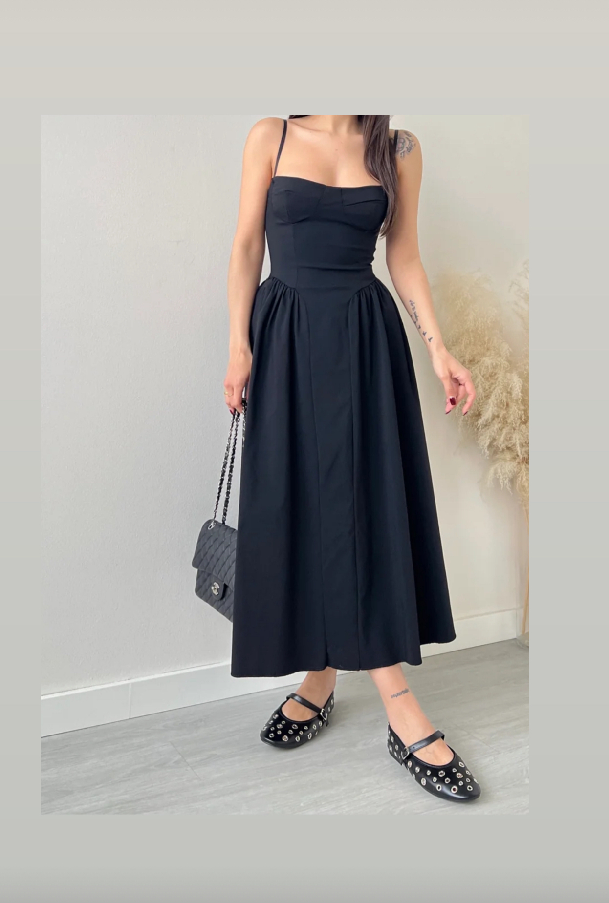 Featuring a structured corset-style bodice that flatters the silhouette, delicate spaghetti straps, and a voluminous A-line midi skirt, it blends vintage inspiration with modern flair.