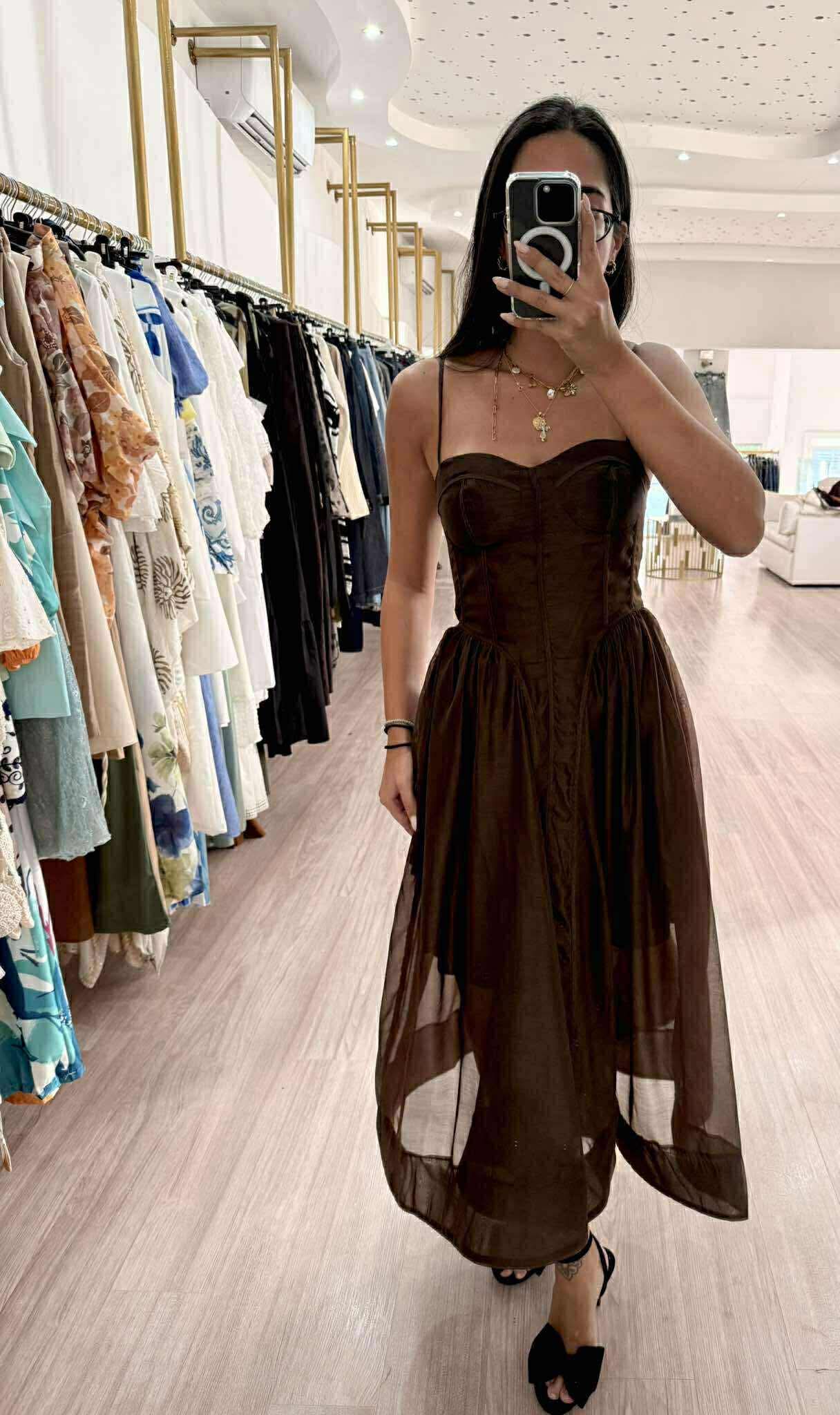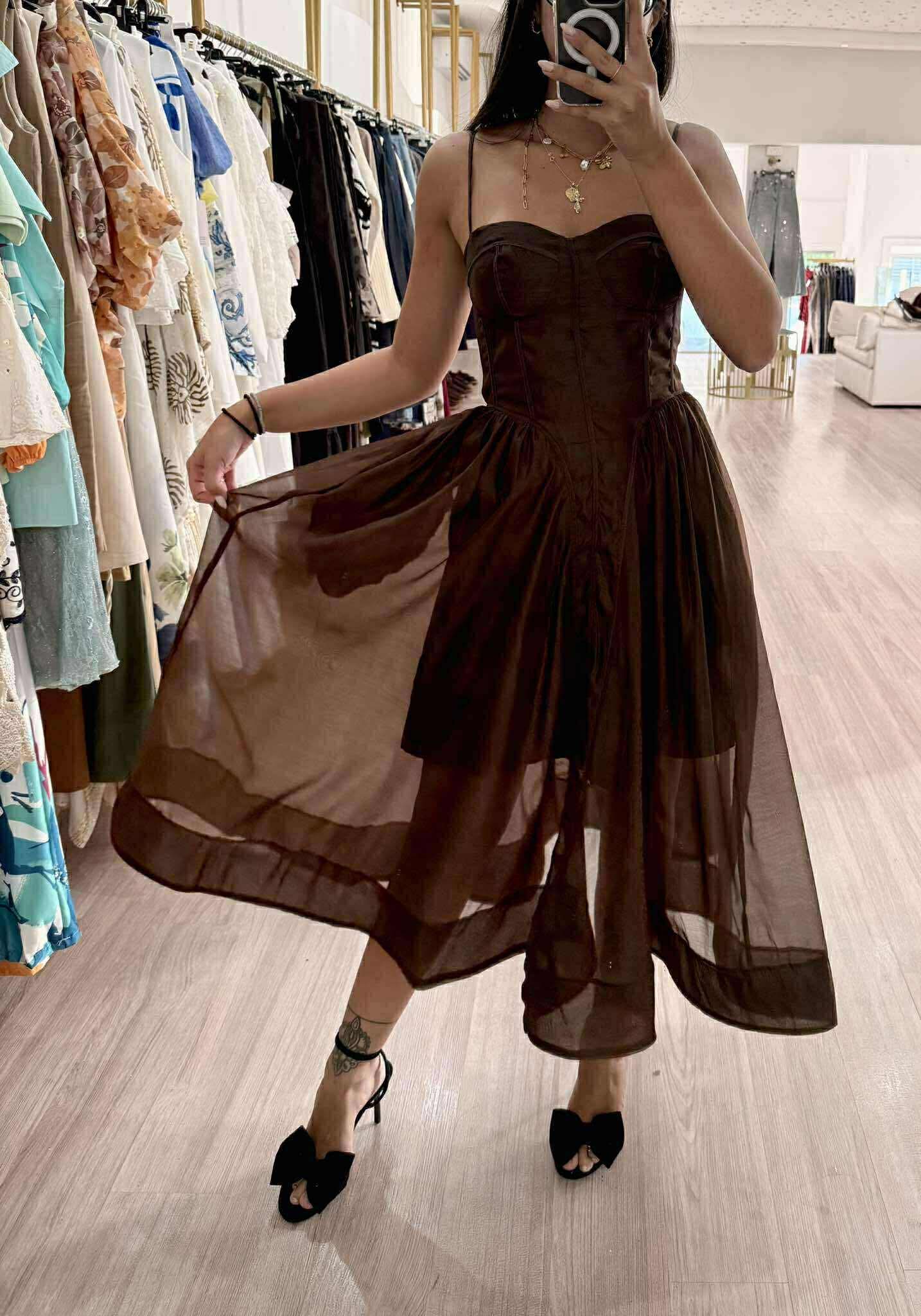 Α romantic yet modern piece, this chocolate brown midi dress combines the structure of a corset bodice with the lightness of a sheer, flowy skirt.
