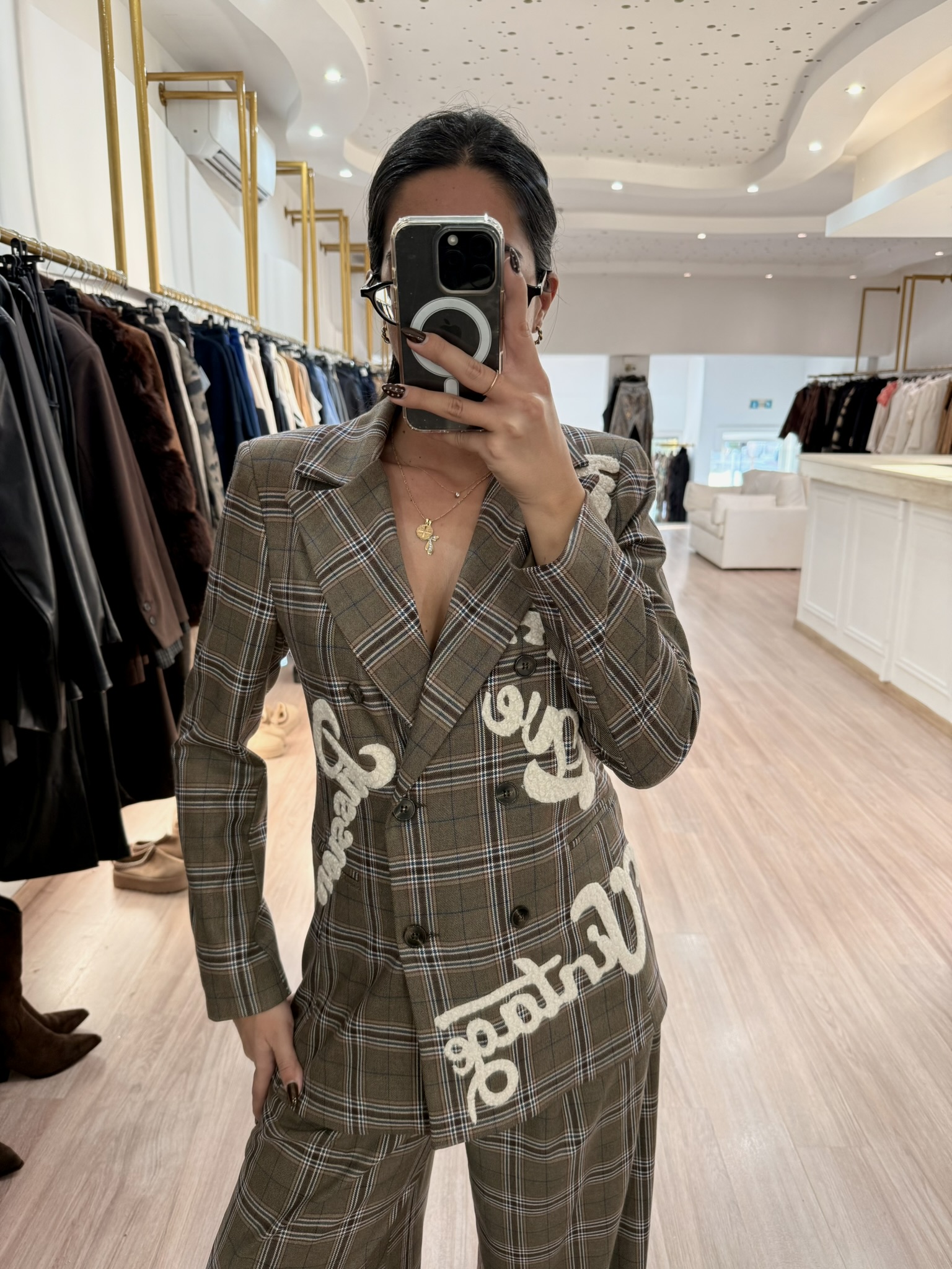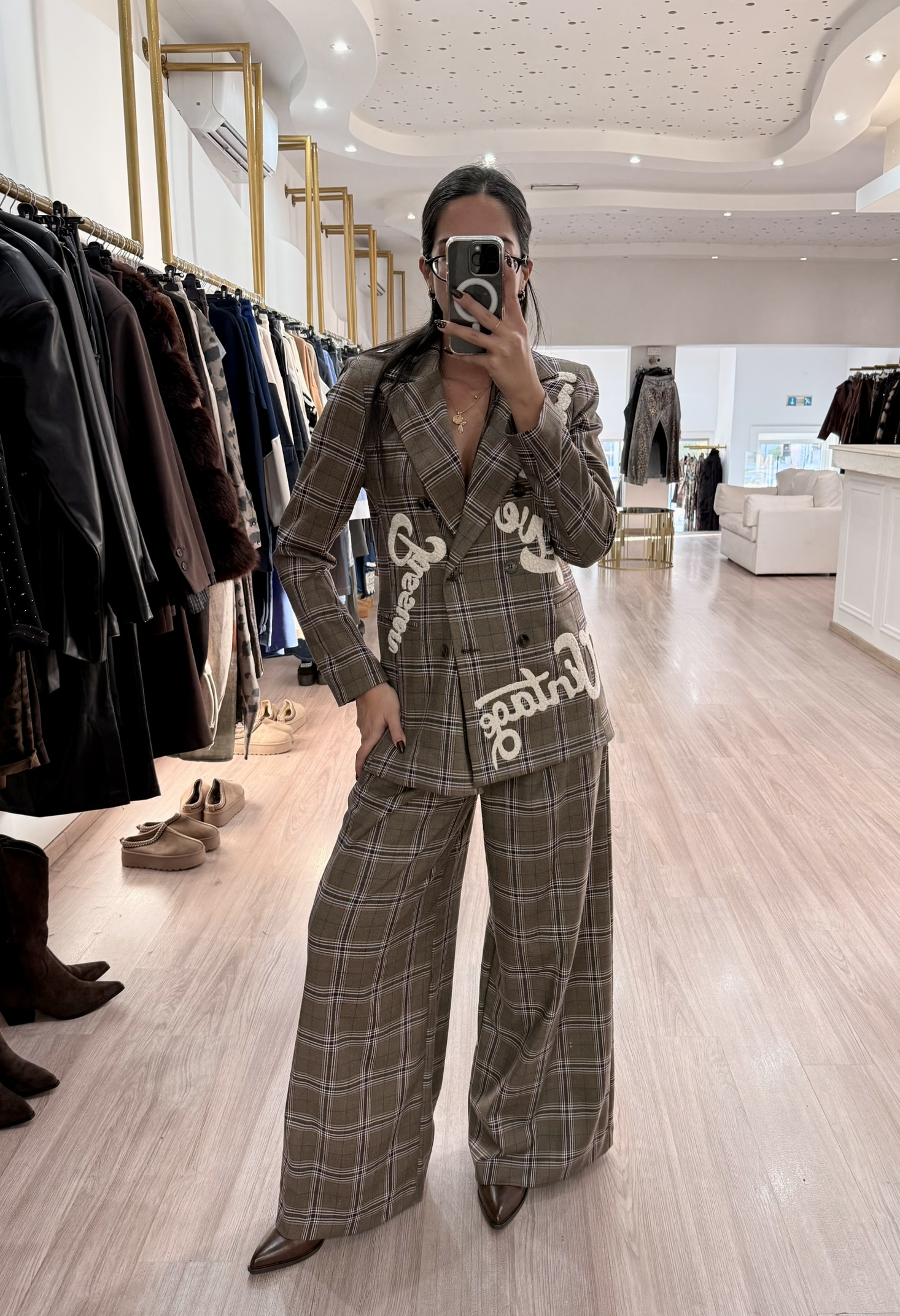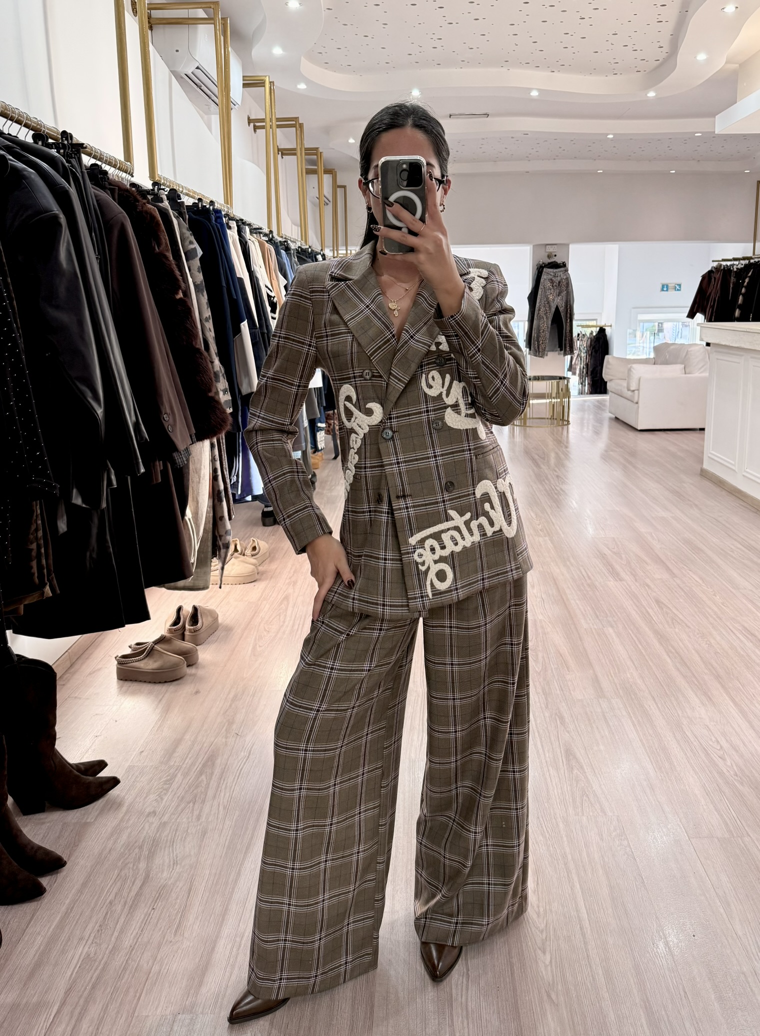 This checked suit set features a double-breasted blazer with statement embroidery and wide-leg trousers that elongate the silhouette.