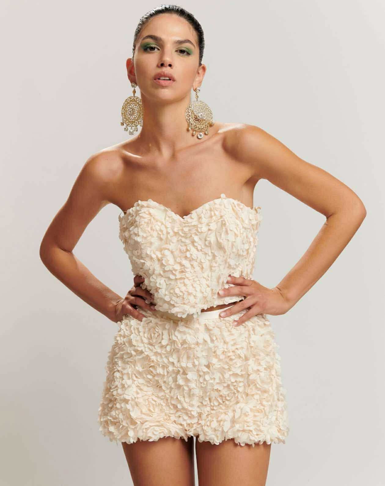 Elevate your look with this stunning two-piece set, featuring a strapless crop top and matching high-waist shorts, both adorned with delicate 3D floral appliqué.